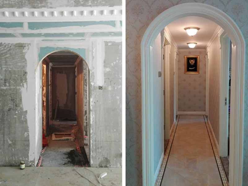 左圖是裝修前的過道拱門,右圖是精心設計裝修的新拱門,前后的對比是不是有很大的變化呢,幕前所有的呈現永遠都是美麗的,漂亮的,只因有幕后設計師和工長工人們的不懈努力,才有這最后完美的展現,那么讓我們一起走進海晟名苑15號樓3樓吧。