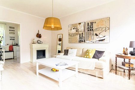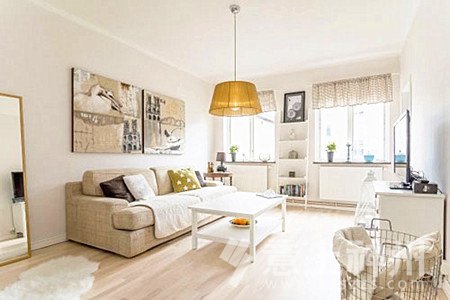 客廳中以淺色木質(zhì)地板與白色墻面結(jié)合,呈現(xiàn)出一個整潔自然客廳格局,米色沙發(fā)放于客廳之中,土黃色吊燈懸于半空,無一不透露出一種自然感。