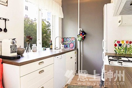 灰色的墻面在廚房內(nèi)也顯得尤為協(xié)調(diào),這間屋子空間雖然不大,卻在小小的廚房內(nèi)居然也擁有兩扇不小的窗戶,給予了這個空間不錯的采光以及新鮮的空氣。