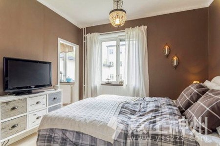 而在雙人床一旁的墻面上嵌有兩盞小小的壁燈,看起來優(yōu)雅無比,房主還利用床尾的空閑空間擺放上了一張具有強大收納功能的電視柜,這樣既能在臥室里看電視,還能在利用電視柜收納不少東西,一舉兩得。